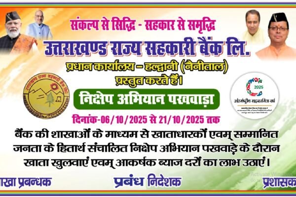 निक्षेप अभियान पखवाड़ा” से जागी वित्तीय चेतना उत्तराखण्ड राज्य सहकारी बैंक ने शुरू किया जनसंपर्क का नया अध्याय : प्रदीप मेहरोत्रा जन-जन तक पहुँच रही सहकारिता, बचत से समृद्धि की ओर प्रदेश का कदम सहकारिता मंत्री डॉ. धन सिंह रावत जी के निर्देशन एवं प्रेरणा से उत्तराखण्ड राज्य सहकारी बैंक लिमिटेड द्वारा दिनांक 06 अक्टूबर…