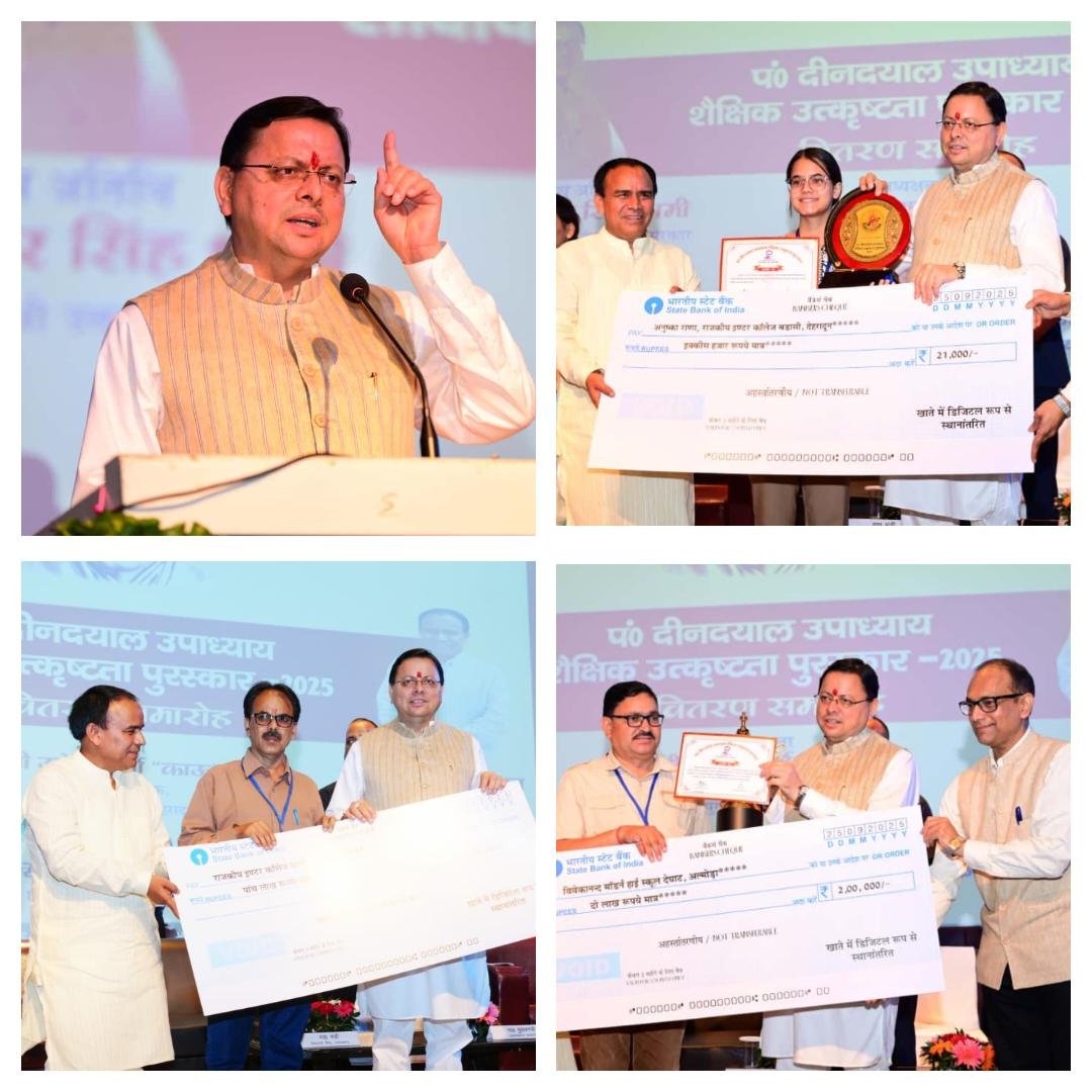 देहरादून : मुख्यमंत्री पुष्कर सिंह धामी ने गुरुवार को नानूरखेड़ा स्थित एससीईआरटी ऑडिटोरियम में आयोजित पंडित दीनदयाल उपाध्याय शैक्षिक उत्कृष्टता पुरस्कार समारोह में बोर्ड परीक्षाओं में शीर्ष 10 स्थान प्राप्त करने वाले हाईस्कूल एवं इंटरमीडिएट के 75 मेधावी छात्र-छात्राओं को पुरस्कृत किया। इस मौके पर बोर्ड परीक्षाओं में उत्कृष्ट परिणाम देने वाले विद्यालयों के तीन-तीन प्रधानाचार्यों के साथ ही श्रेष्ठ प्रदर्शन करने वाले शीर्ष 50-50 विद्यालयों के प्रधानाचार्यों को भी सम्मानित किया।