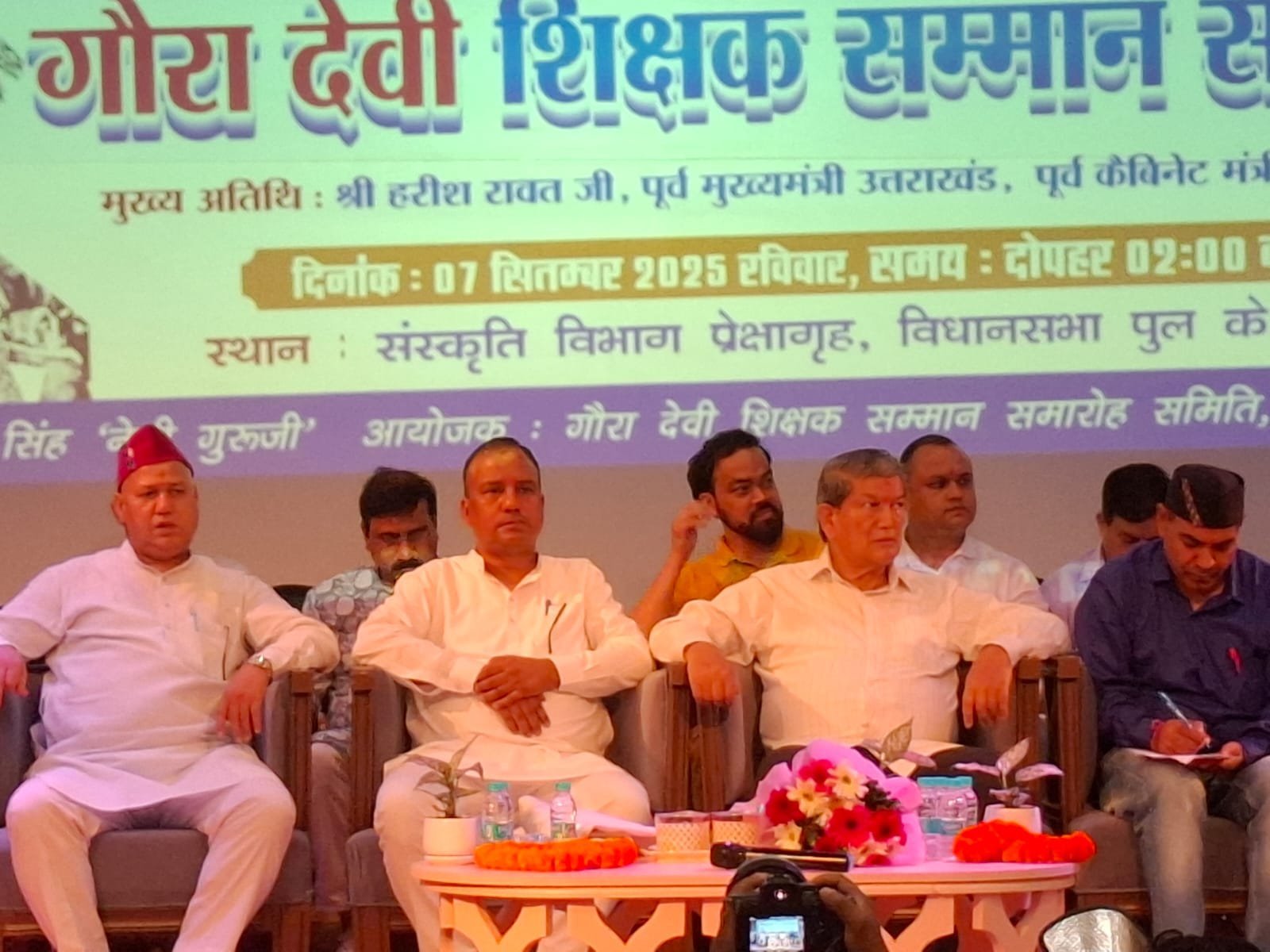 देहरादून: आज दिनांक 7 सितंबर 2025 को संस्कृति विभाग प्रेक्षागृह देहरादून में गौरा देवी शिक्षक सम्मान समिति द्वारा जनपद देहरादून के शिक्षकों को सम्मानित किया गया। समिति के मुख्य अतिथि पूर्व मुख्यमंत्री हरीश रावत जी एवं महावीर सिंह रावत पूर्व राज्य मंत्री रहे। कार्यक्रम का शुभारंभ मुख्य अतिथियों एवं संगठन के पदाधिकारी द्वारा दीप प्रज्वलित कर किया गया तत्पश्चात बच्चों के द्वारा सरस्वती वंदना प्रस्तुत की गई। कार्यक्रम में महान दार्शनिक एवं भारत के द्वितीय राष्ट्रपति डाॅ सर्वपल्ली राधाकृष्णन के जीवनवृत्त पर प्रकाश डाला गया तथा चिपको वूमन गौरा देवी जी का संक्षिप्त जीवन परिचय की डाॅकोमेन्ट्री भी प्रदर्शित की गई।