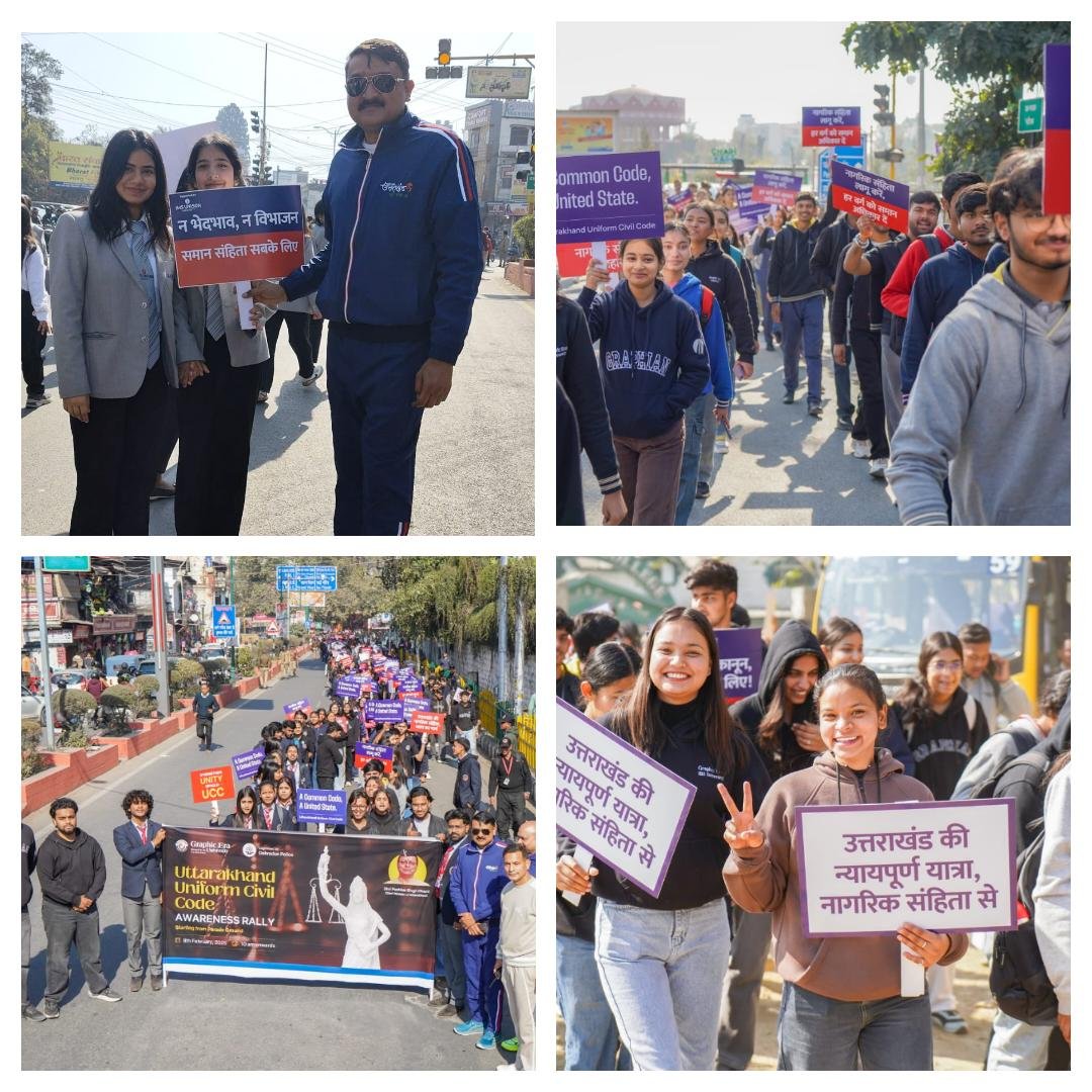 यू0सी0सी0 के सम्बंध में आमजन को जागरूक करने के उद्देश से निकाली गई जागरूकता रैली परेड ग्राउंड से प्रारम्भ होकर दर्शनलाल चौक, घंटाघर होते हुए रेर्जस ग्राउंड में समाप्त हुई। रैली के दौरान ग्राफ़िक एरा तथा डी०आई०टी० के छात्रों द्वारा पोस्टर, बैनर्स तथा स्लोगन के माध्यम से ’’ वन नेशन वन कोड ’’ का समर्थन करते हुए आमजन को यू०सी०सी० के संबंध में किया जागरूक किया गया। इस दौरान उनके द्वारा यू०सी०सी० को कानूनी एकरूपता और सामाजिक न्याय को बढ़ावा देने वाला कानून बताते हुए नागरिक कानूनों में समानता और निष्पक्षता सुनिश्चित करने में यू०सी०सी० के महत्व के संबंध में आमजन को जागरूक किया।